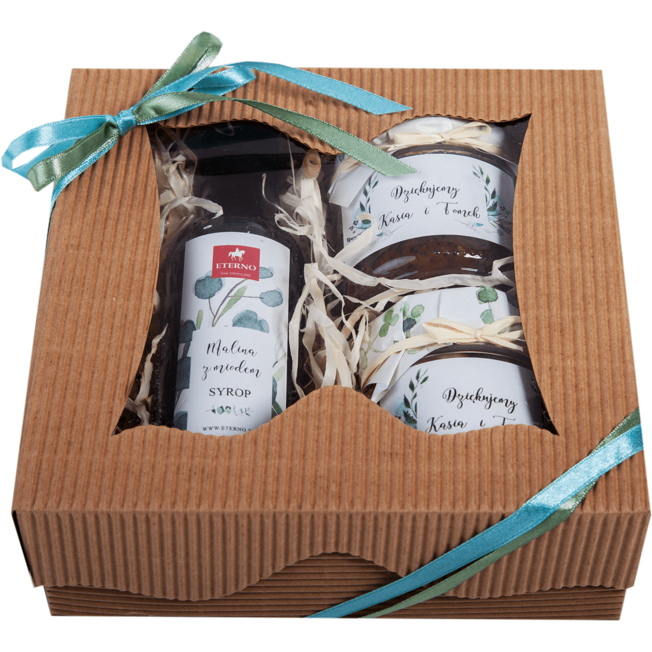 Jest opcja zmiany smaku przetworów, trzeba tylko ustalić to z dostawcą podczas składania zamówienia. Na skrzyneczce służącej za ozdobne opakowanie dla prezentu umieszczany jest grawer dowolnej treści, wybrany przez klienta. Spersonalizowane etykiety znajdują się też na słoiczkach z przetworami. Przy składaniu zamówienia można od razu dobrać do zestawu kartkę okolicznościową, a jeśli potrzebne są dodatkowe ustalenia, wystarczy skontaktować się z obsługą klienta w Eterno.